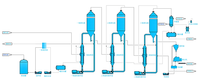 在多效蒸發(fā)器中,可將二次蒸器當(dāng)作加熱蒸汽,引入另一個(gè)蒸發(fā)器,只要后者蒸發(fā)室壓力和溶液沸點(diǎn)均較原來(lái)蒸發(fā)器中的為低,則引入的二次蒸汽即能起加熱熱源的作用。同理,第二個(gè)蒸發(fā)器新產(chǎn)生的新的二次蒸汽又可作為第三蒸發(fā)器的加熱蒸汽。這樣,每一個(gè)蒸發(fā)器即為一效,將多個(gè)蒸發(fā)器連接起來(lái)一同操作,即組成一個(gè)多效蒸發(fā)系統(tǒng)。加入生蒸汽的蒸發(fā)器稱(chēng)為第一效,利用第一效二次蒸汽加熱的成為第二效,依次類(lèi)推。